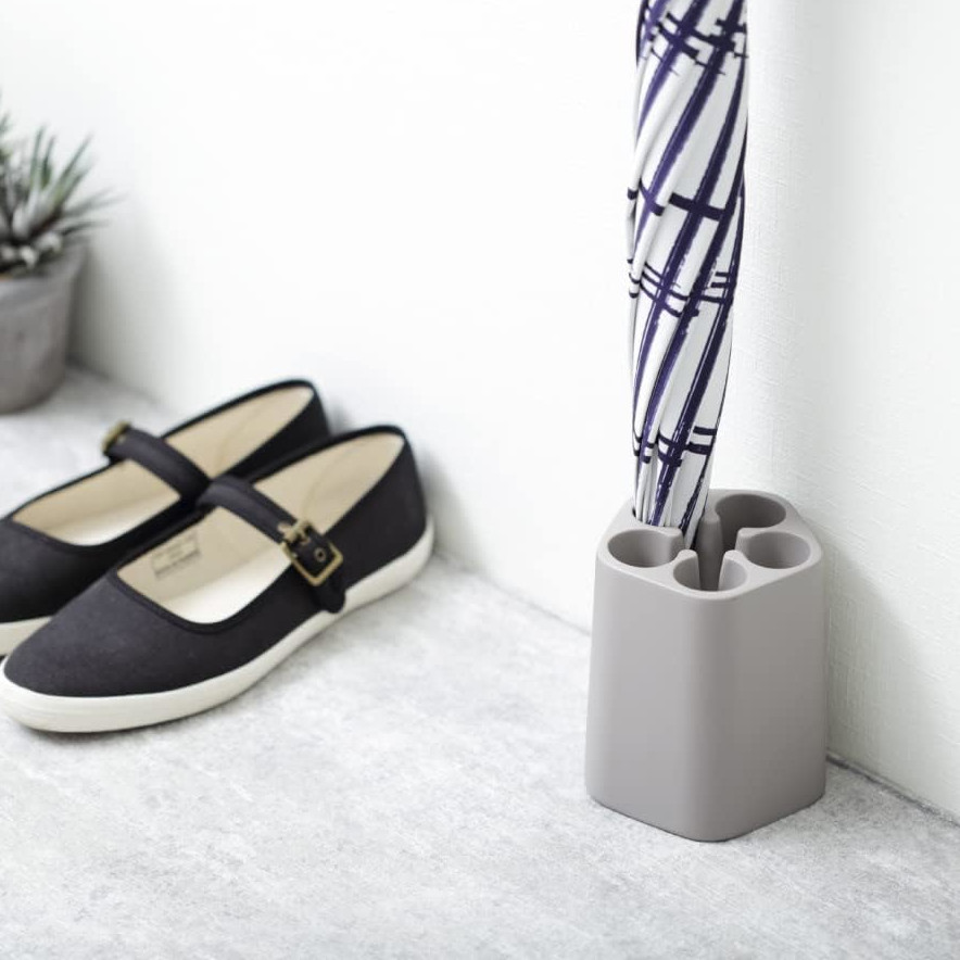 左官職人の技術や材料を用いてつくられるプロダクトブランド「ソイル(soil)」。こちらは日本産の珪藻土(けいそうど)を使用してつくられた傘立てです。濡れた傘を指すだけで珪藻土が滴り落ちる雨水を吸収、時間がたつと自然と乾くので玄関が水でびちゃびちゃになったり、湿気がこもる心配もありません。使わないときは下駄箱に入れておくと内部の湿気も吸収してくれます。