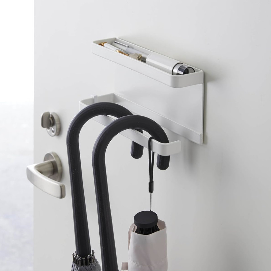 シンプルなマグネットタイプの傘立て。吊り下げ式で折り畳み傘もストラップに引っ掛けて収納できます。強力なマグネットを使用してるので傘をかけてもずれ落ちません。4本まで収納可能。