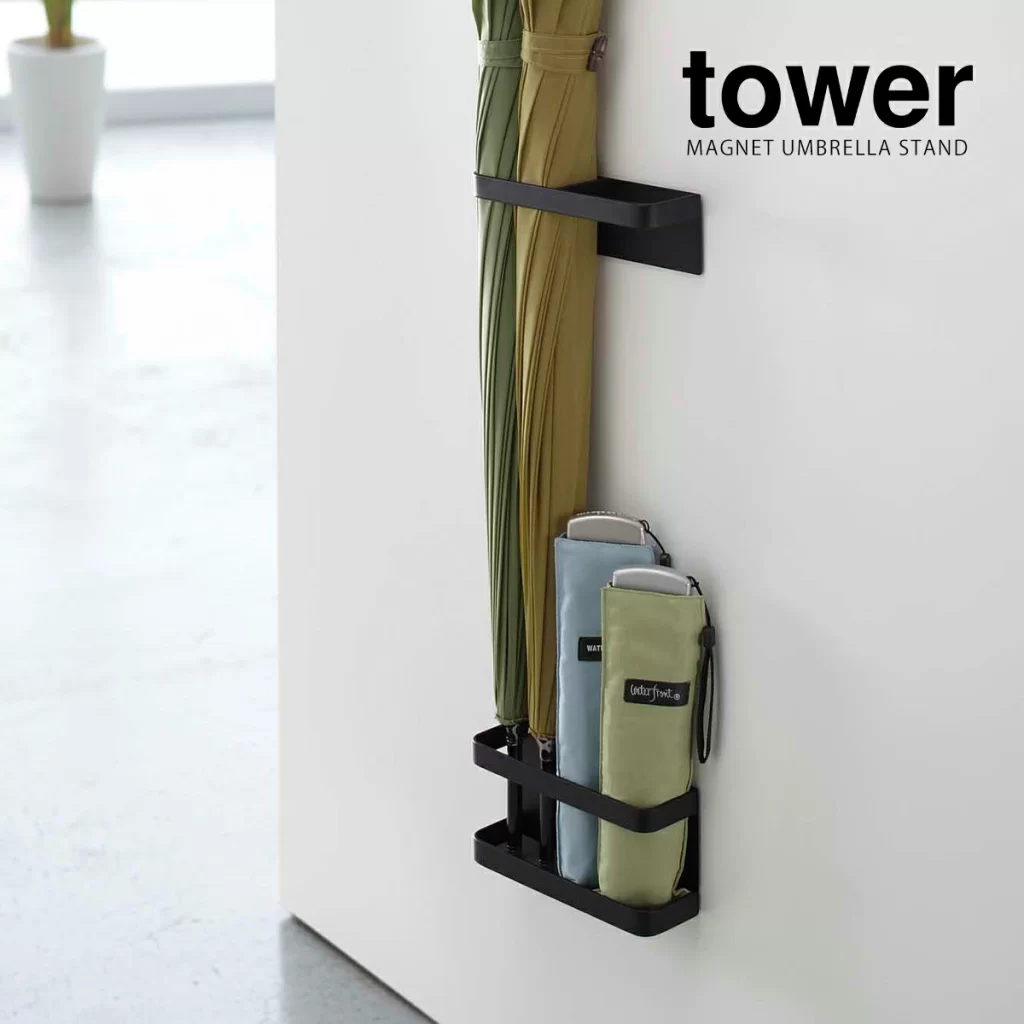 スチール製インテリア雑貨メーカーの山崎実業の人気シリーズタワーのマグネット式傘立て。スリムで磁石の力で鉄製扉などにもくっつくので、デッドスペースが活用できます。長傘のサイズに合わせて高さ調整可能。下ホルダーに折りたたみ傘も収納できる便利な傘立てです。4本まで収納可能。