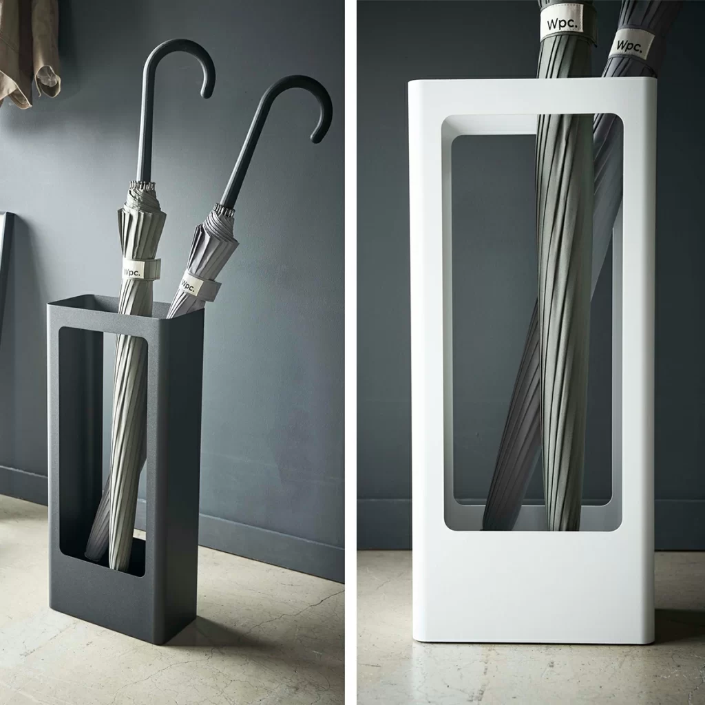 デザイナー羽場一郎氏により設立されたインテリアブランド「イデアコ」のスリム傘立て。壁面へぴったりつけられる台形フォルムで玄関のじゃまにならない省スペースデザインです。底面には滑り止めも兼ねた保護材がついているのもうれしいポイント。