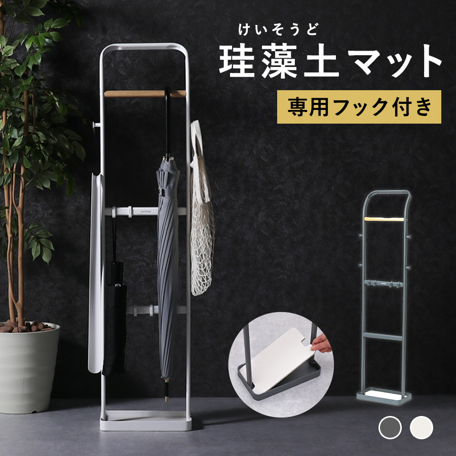 底に珪藻土マットを使用した引っ掛けタイプのアンブレラスタンド。長傘・折りたたみ傘のほかにも靴ベラなど玄関小物も置ける便利な傘立てです。組み立ても簡単で、引っ掛けるためのフック付きなのもうれしいポイント。