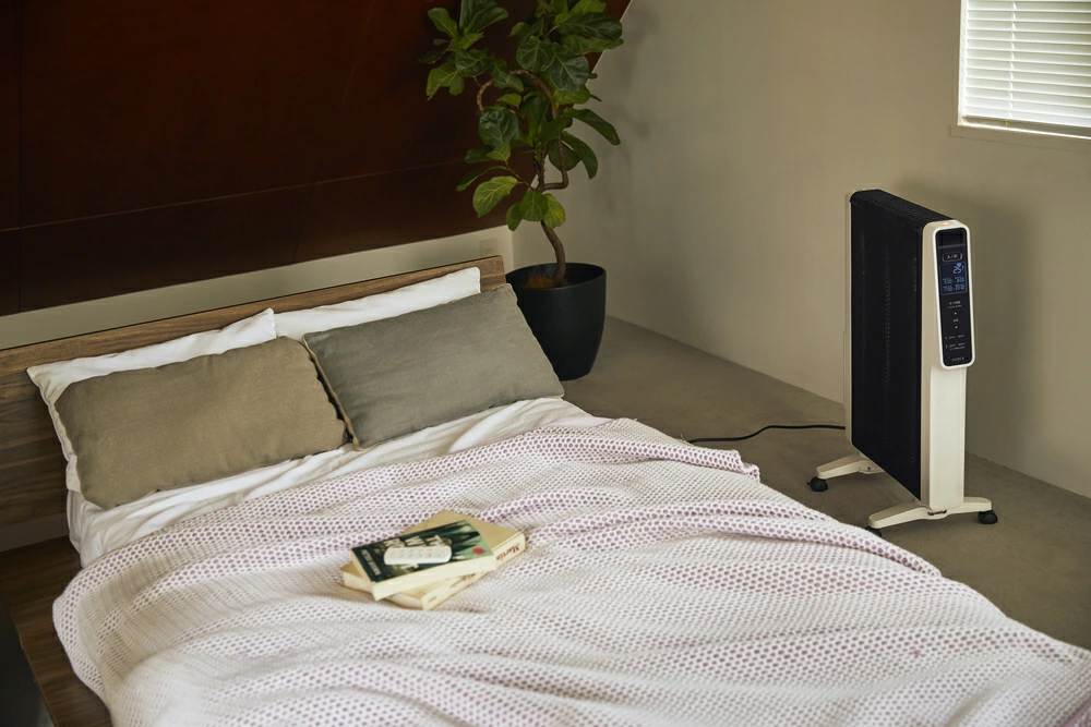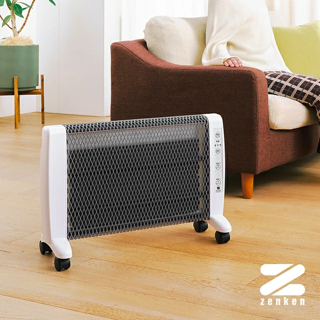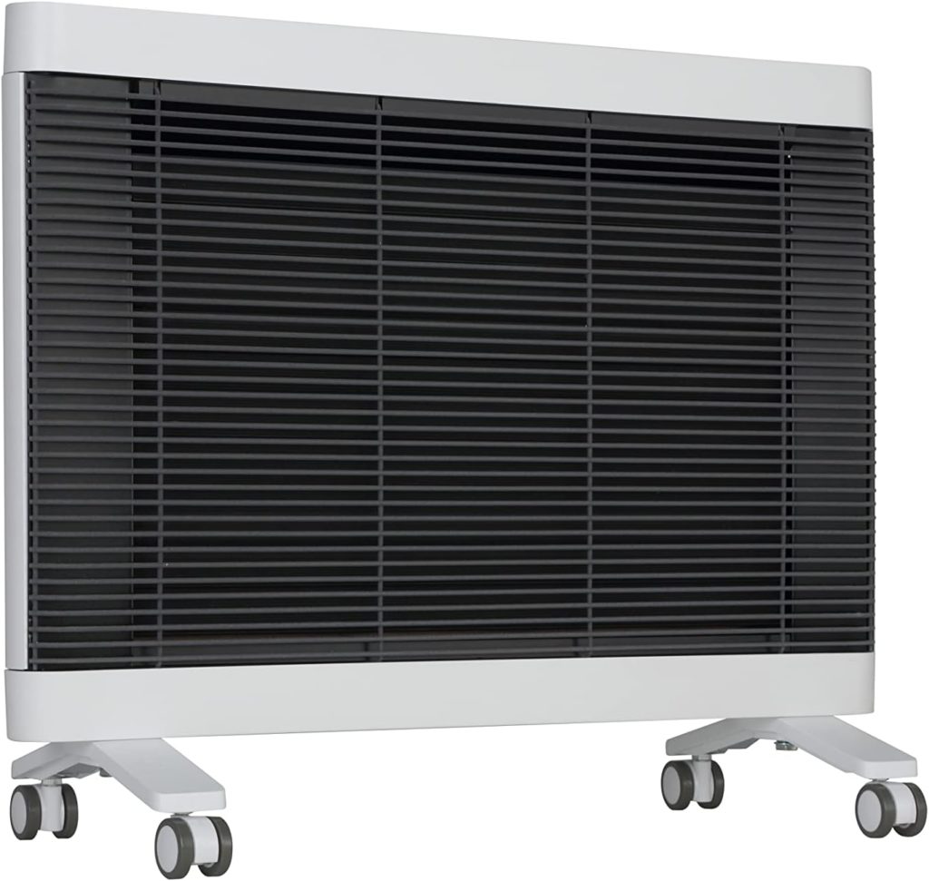 パネルヒーターは、その名の通りパネル型のスリムな暖房器具で、一般的には輻射熱(ふくしゃねつ)を利用して身体やお部屋を暖めます。エアコンやファンヒーターのように風を起こして空気を暖めるのではなく、電磁波(主に赤外線)の放射をうけたものを内側から暖める暖房器具で、ヒトの肌を直接暖める効果があります。